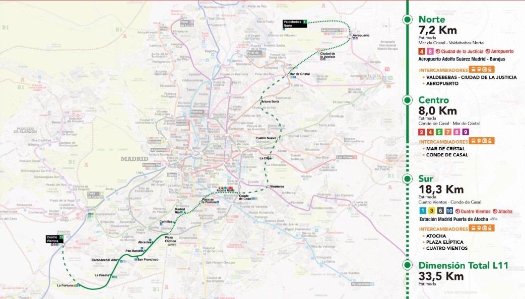 Tras valorar cuatro opciones, el Gobierno regional ha dado luz verde a la que unirá Mar de Cristal con Valdebebas Norte conectando puntos como la T4 del Aeropuerto Adolfo Suárez-Madrid Barajas e Ifema Madrid. Se distribuirán de la siguiente manera: