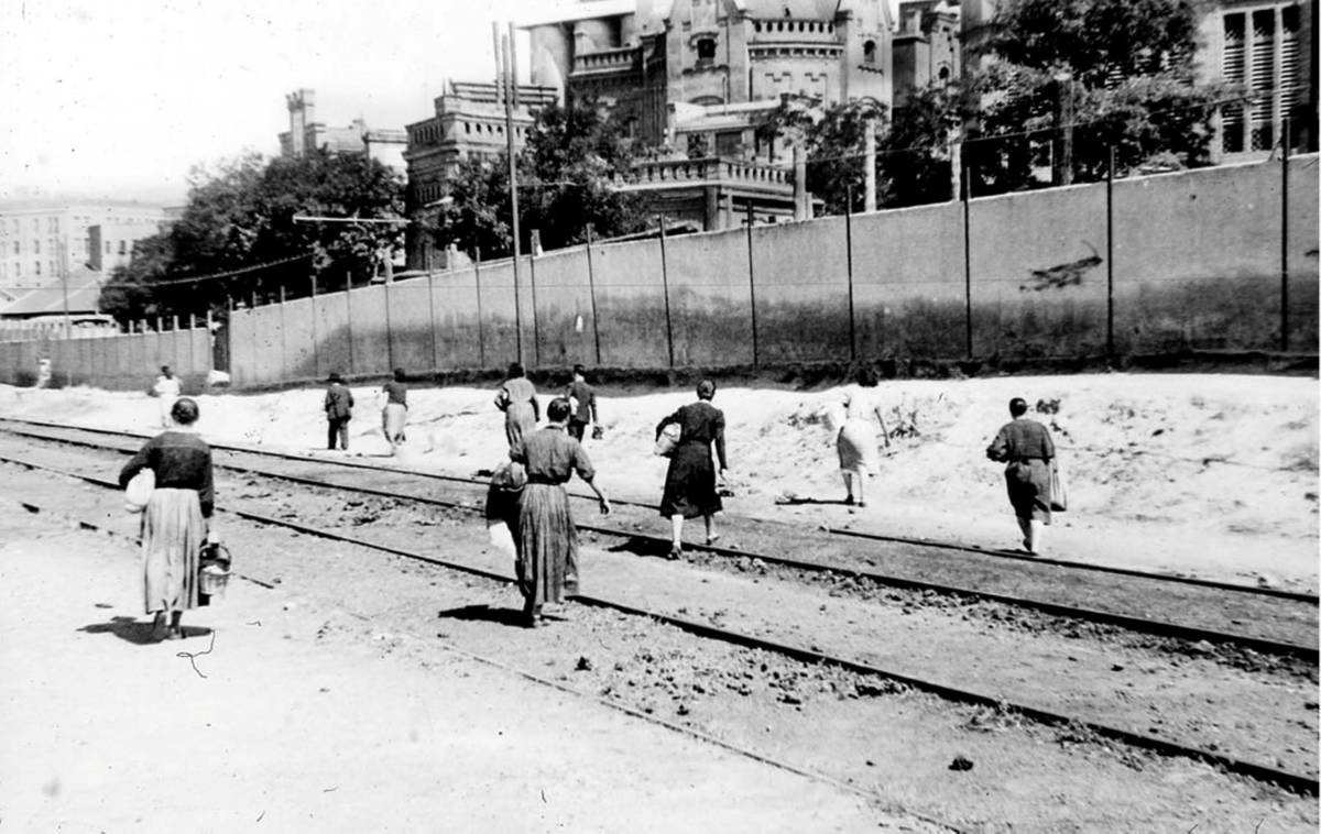 Dieses Foto aus dem Jahr 1941 zeigt genau auf diesem Streckenabschnitt mehrere Personen, die den Bahnhof Delicias-Empalme zu Fuß überqueren, um sich der Überwachung zu entziehen: Schmuggler, die mitten in der Nachkriegszeit zwischen Príncipe Pío und Atocha unterwegs waren und Lebensmittel und kleine Waren transportierten. Im Hintergrund die Anlagen der ehemaligen Brauerei El Águila – heute die Bibliothek Joaquín Leguina – und im Vordergrund das Bild eines Viertels, das so gut es ging überlebt hat, mit der Eisenbahn als Hauptachse und Hintergrund.