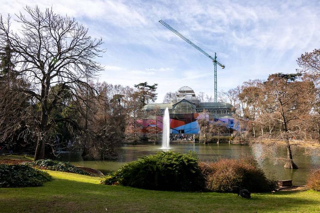 Ni cubierto por andamios se salva el Palacio de Cristal de ser un enclave cultural atípico de la ciudad. Ahora la protagonista es la lona que lo envuelve durante su restauración que desde ayer es en una gran obra de arte contemporáneo. El edificio se viste con Fardo, una instalación de la artista peruana Andrea Canepa que transforma el icono de cristal en un enorme paquete textil de mil metros cuadrados, lleno de colores y capas, visible desde todos los paseos que rodean el estanque.