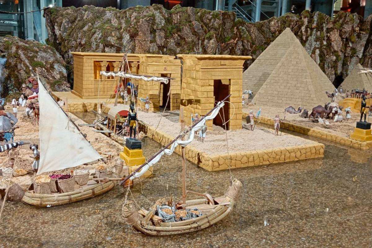 Outre la crèche traditionnelle, la Casa de Correos a choisi de représenter les scènes de la fuite en Égypte, avec des lieux emblématiques tels que les pyramides de Gizeh, le Grand Sphinx, des marchés ou un port fluvial inspiré de la ville égyptienne d’Assiout.
