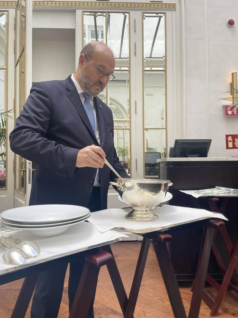 Pour finir, on sert au dessert une torrija, qui fait partie du menu, dans une sorte de soupe de crème pâtissière et de glace au nougat. Le roi aimait accompagner ce plat typiquement madrilène de champagne, et l’espace vous invite à suivre les conseils du monarque.