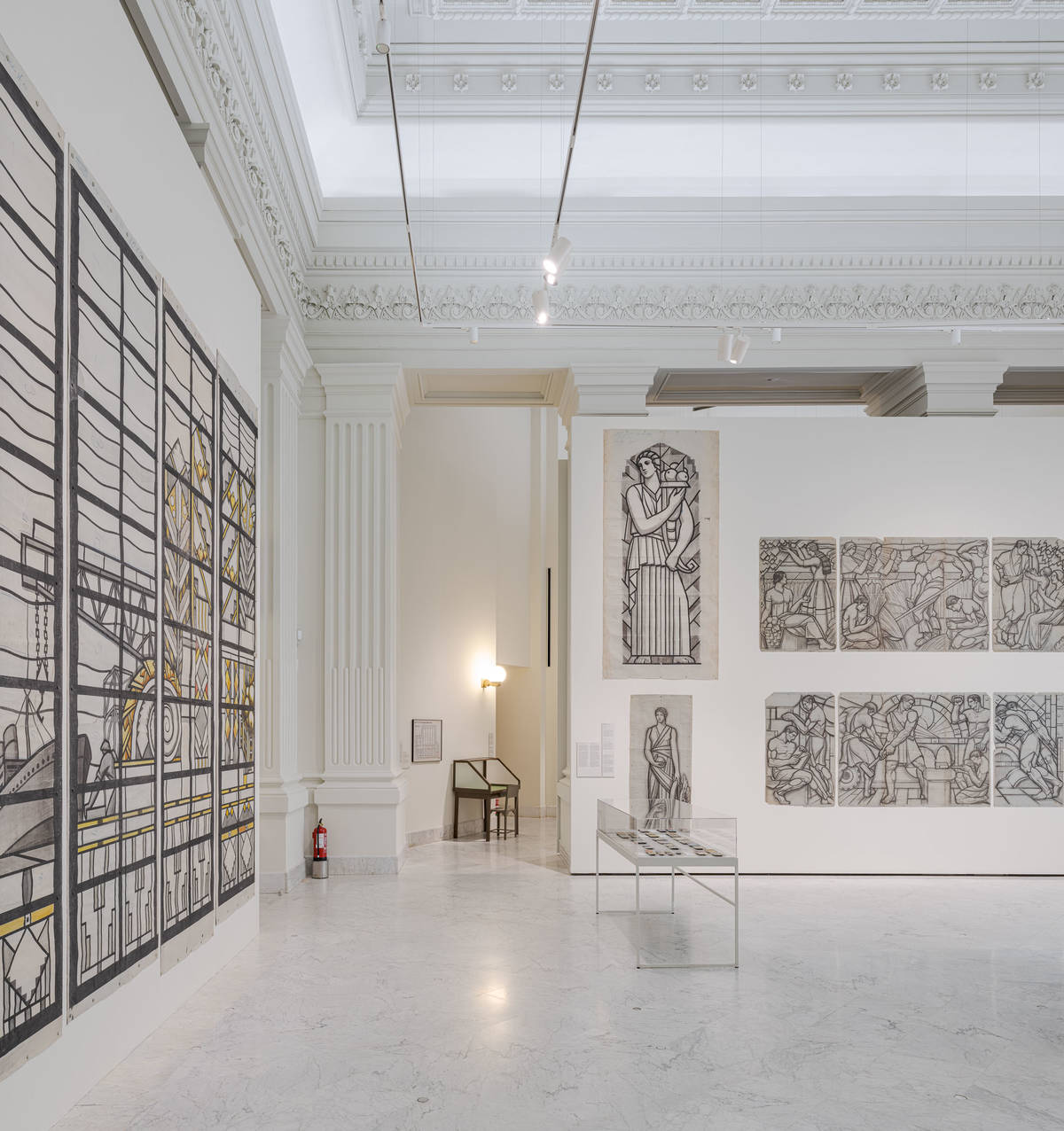 Entrambi gli spazi sono influenzati da un’estetica che, all’epoca, respirava modernità: l’art déco. Questo stile, con la sua geometria pulita e la sua sobria raffinatezza, è incarnato da uno dei suoi elementi più emblematici: le vetrate disegnate dalla storica Casa Maumejean. Queste composizioni, ora in mostra restaurate per la prima volta, trasformano il lavoro e la tecnologia – agricoltura, industria, ferrovie e aviazione – in allegorie di una nazione in via di trasformazione.