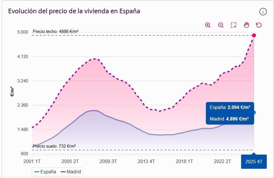 I rapporti trimestrali di Tinsa confermano che la capitale Madrid sta guidando l’aumento dei prezzi in Spagna, con incrementi che sfiorano o superano il 20% su base annua in alcuni periodi del 2025 e del 2026. La città ha intensificato la crescita dalla fine del 2024 e rimane al di sopra della media nazionale sia in termini percentuali che di prezzo assoluto.