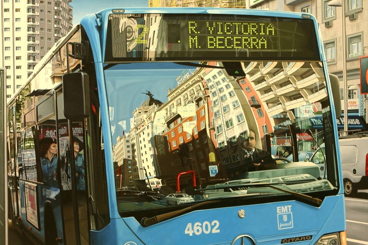 Antes de pintar cada tela, o artista passeia pela cidade com a sua máquina fotográfica e capta o que vê à sua volta: comboios, carros ou o reflexo da Gran Vía num limpa para-brisas. Desta forma, actua como um repórter do presente na paisagem urbana.